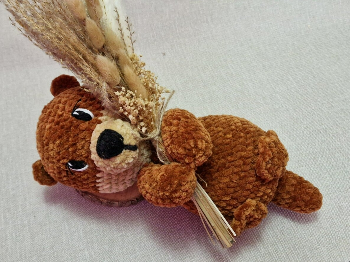 Son pelage brun chaud, son museau clair et son air paisible en font une mascotte irrésistible, à mi-chemin entre l’objet décoratif et le doudou qu’on a envie de garder près de soi.